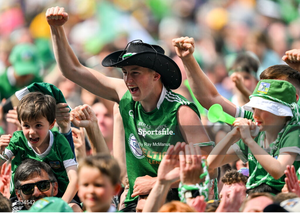 11 June 2023; Limerick supporters celebrate after the Munster GAA Hurling Championship Final match between Clare and Limerick at TUS Gaelic Grounds in Limerick. Photo by Ray McManus/Sportsfile