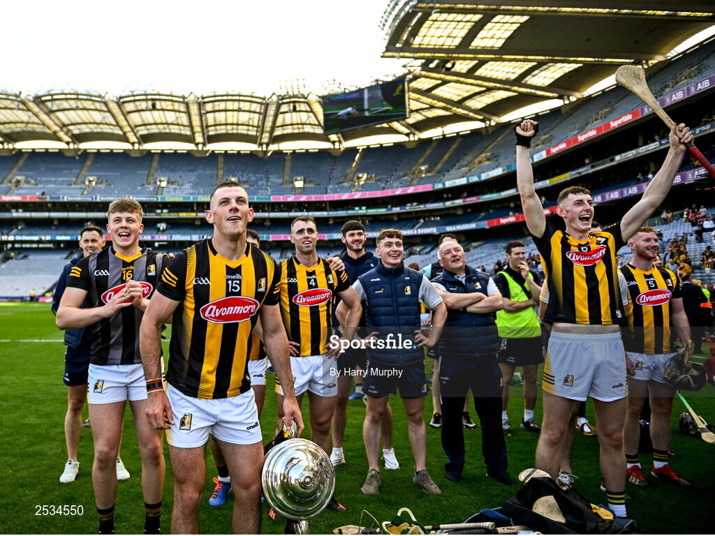 11 June 2023; Eoin Cody of Kilkenny and teammates watch the winning goal on the big screen after their side's victory in the Leinster GAA Hurling Senior Championship Final match between Kilkenny and Galway at Croke Park in Dublin. Photo by Harry Murphy/Sportsfile