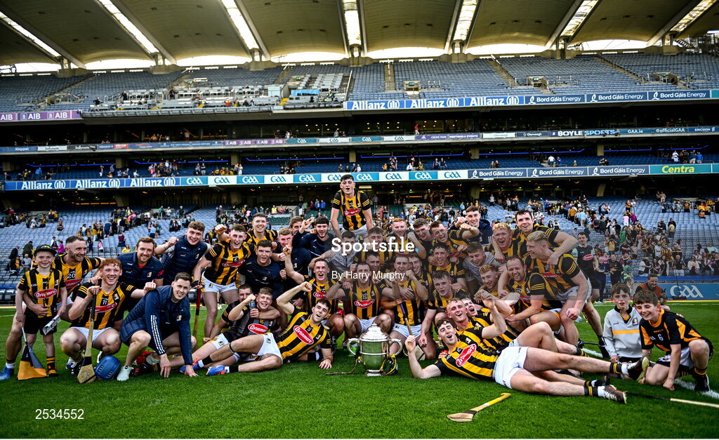 11 June 2023; Kilkenny players celebrates with the Bob O'Keeffe Cup after their side's victory in the Leinster GAA Hurling Senior Championship Final match between Kilkenny and Galway at Croke Park in Dublin. Photo by Harry Murphy/Sportsfile