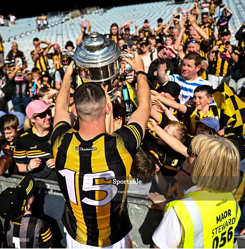 11 June 2023; Eoin Cody of Kilkenny celebrates with the Bob O'Keeffe Cup after his side's victory in the Leinster GAA Hurling Senior Championship Final match between Kilkenny and Galway at Croke Park in Dublin. Photo by Harry Murphy/Sportsfile