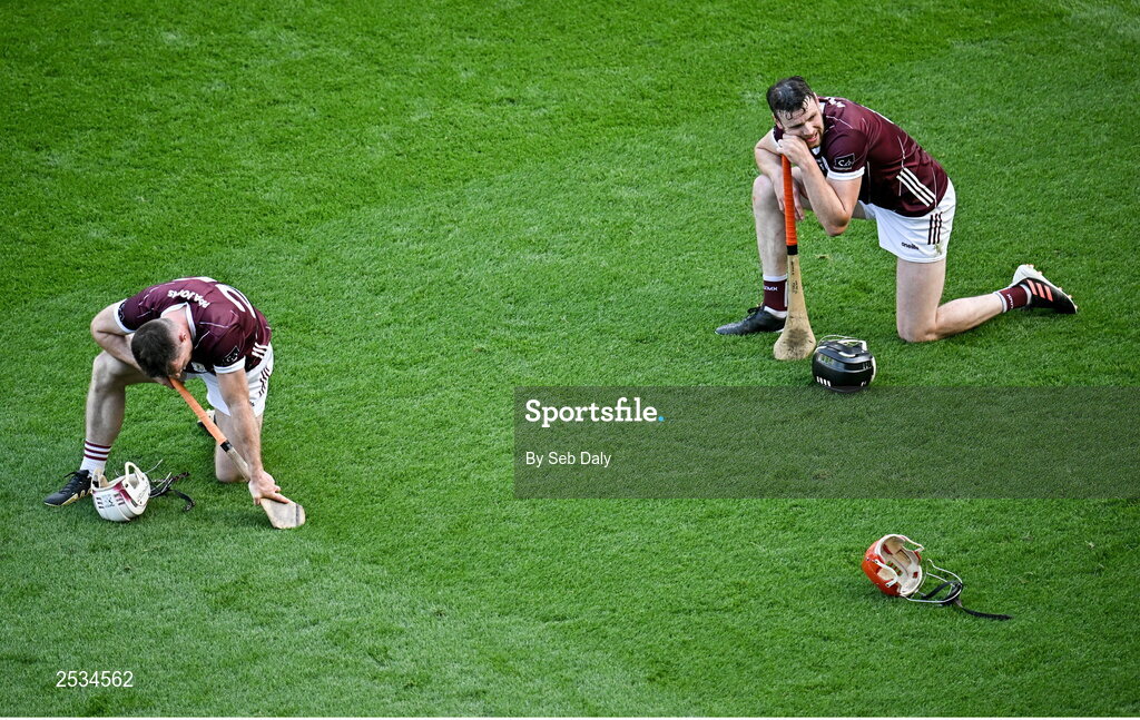 11 June 2023; Galway players Joseph Cooney, right, and Seán Linnane after their side's defeat in the Leinster GAA Hurling Senior Championship Final match between Kilkenny and Galway at Croke Park in Dublin. Photo by Seb Daly/Sportsfile