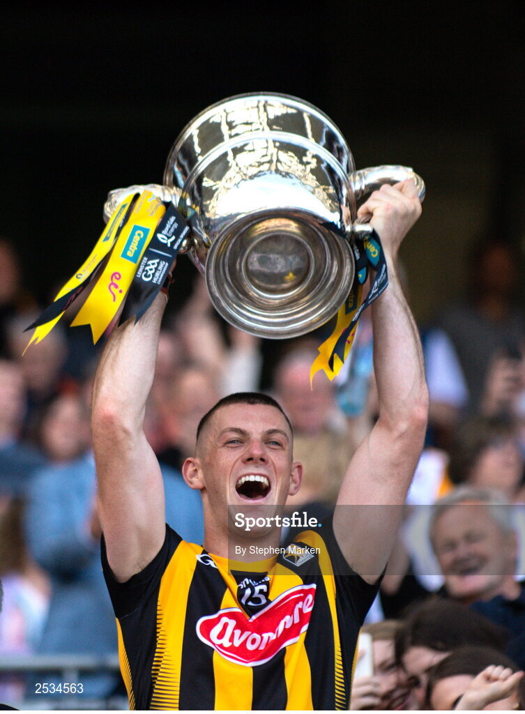 11 June 2023; Kilkenny captain Eoin Cody lifts the Bob O'Keeffe Cup after his side's victory in the Leinster GAA Hurling Senior Championship Final match between Kilkenny and Galway at Croke Park in Dublin. Photo by Stephen Marken/Sportsfile