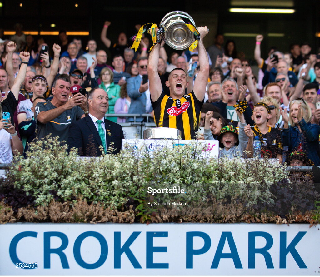 11 June 2023; Kilkenny captain Eoin Cody lifts the Bob O'Keeffe Cup after his side's victory in the Leinster GAA Hurling Senior Championship Final match between Kilkenny and Galway at Croke Park in Dublin. Photo by Stephen Marken/Sportsfile