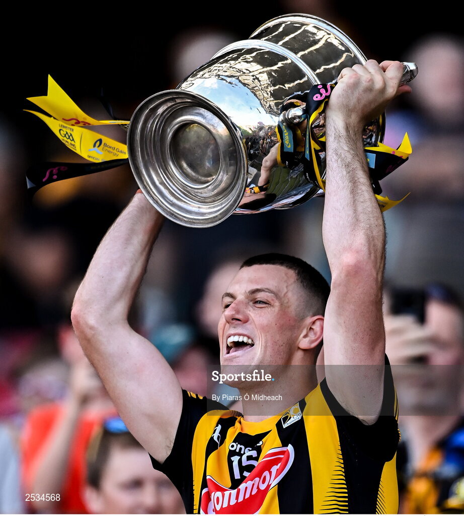 11 June 2023; Kilkenny captain Eoin Cody lifts the Bob O'Keeffe Cup after his side's victory in the Leinster GAA Hurling Senior Championship Final match between Kilkenny and Galway at Croke Park in Dublin. Photo by Piaras Ó Mídheach/Sportsfile