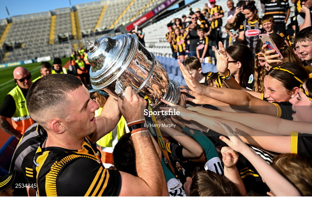 11 June 2023; Eoin Cody of Kilkenny celebrates with the Bob O'Keeffe Cup and supporters after his side's victory in the Leinster GAA Hurling Senior Championship Final match between Kilkenny and Galway at Croke Park in Dublin. Photo by Harry Murphy/Sportsfile