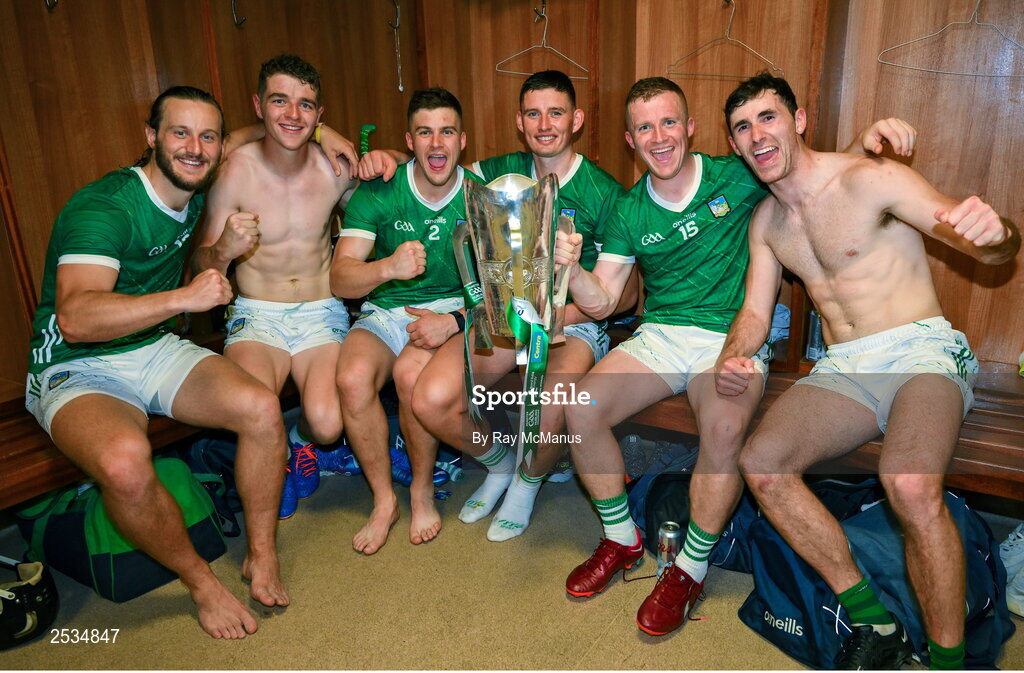 11 June 2023; Limerick players, from left, Tom Morrissey, David Reidy, Michael Casey, Gearoid Hegarty, Peter Casey and Barry Nash after the Munster GAA Hurling Championship Final match between Clare and Limerick at TUS Gaelic Grounds in Limerick. Photo by Ray McManus/Sportsfile