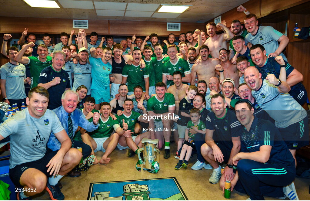 11 June 2023; The Limerick players and officials, including Chairman of the County Board Séamus McNamara, celebrate with the Mick Mackey Cup after the Munster GAA Hurling Championship Final match between Clare and Limerick at TUS Gaelic Grounds in Limerick. Photo by Ray McManus/Sportsfile