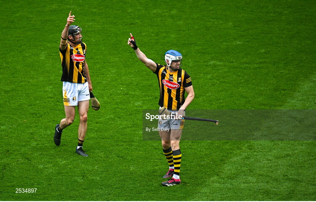 11 June 2023; TJ Reid, right, and Tom Phelan of Kilkenny during the Leinster GAA Hurling Senior Championship Final match between Kilkenny and Galway at Croke Park in Dublin. Photo by Seb Daly/Sportsfile
