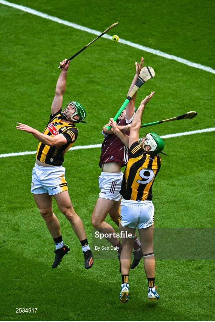 11 June 2023; Brian Concannon of Galway in action against Kilkenny players Tommy Walsh, left, and Paddy Deegan during the Leinster GAA Hurling Senior Championship Final match between Kilkenny and Galway at Croke Park in Dublin. Photo by Seb Daly/Sportsfile