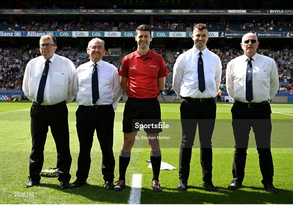11 June 2023; Referee Seán Stack and his umpires before the Leinster GAA Hurling Senior Championship Final match between Kilkenny and Galway at Croke Park in Dublin. Photo by Stephen Marken/Sportsfile