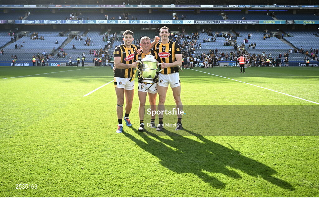 11 June 2023; Kilkenny players, from left, Paddy Deegan, Mikey Butler and Huw Lawlor with the Bob O'Keeffe Cup after their side's victory in the Leinster GAA Hurling Senior Championship Final match between Kilkenny and Galway at Croke Park in Dublin. Photo by Harry Murphy/Sportsfile