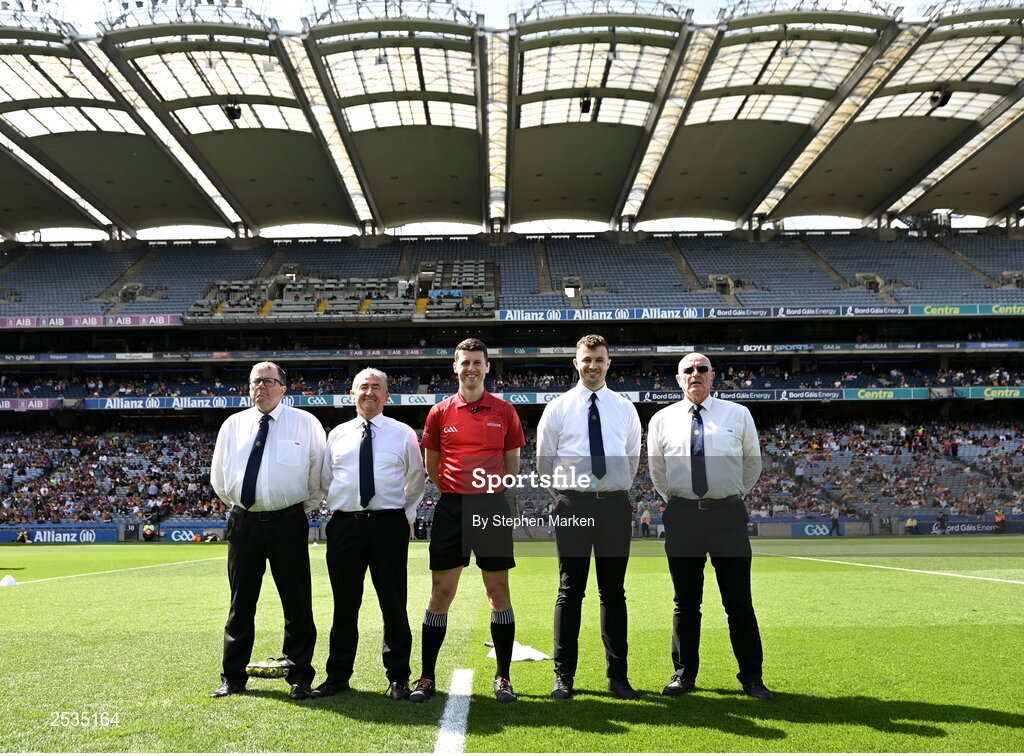 11 June 2023; Referee Seán Stack and his umpires before the Leinster GAA Hurling Senior Championship Final match between Kilkenny and Galway at Croke Park in Dublin. Photo by Stephen Marken/Sportsfile