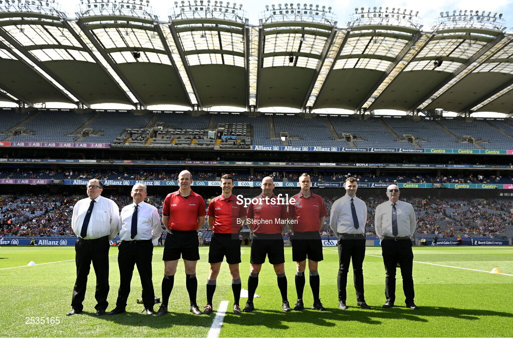 11 June 2023; Referee Seán Stack and his officials before the Leinster GAA Hurling Senior Championship Final match between Kilkenny and Galway at Croke Park in Dublin. Photo by Stephen Marken/Sportsfile