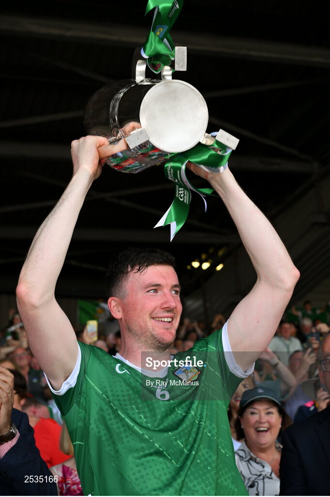 11 June 2023; Limerick captain Declan Hannon lifts the Mick Mackey Cup after the Munster GAA Hurling Championship Final match between Clare and Limerick at TUS Gaelic Grounds in Limerick. Photo by Ray McManus/Sportsfile