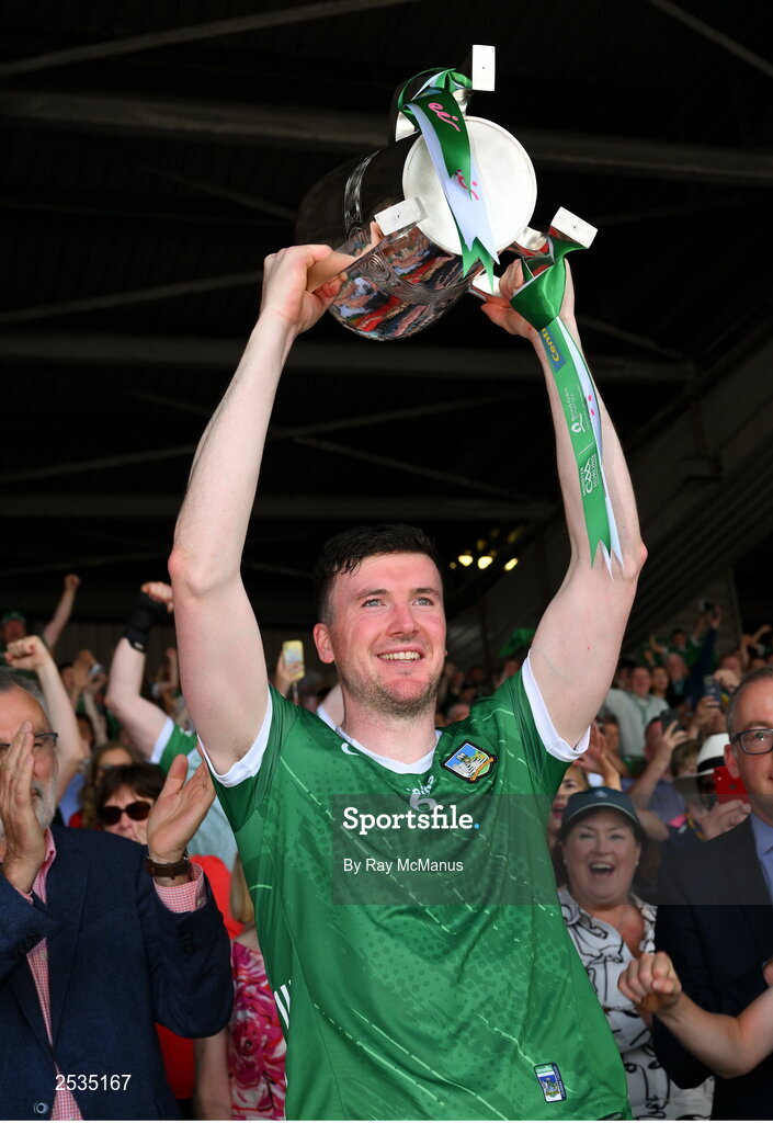 11 June 2023; Limerick captain Declan Hannon lifts the Mick Mackey Cup after the Munster GAA Hurling Championship Final match between Clare and Limerick at TUS Gaelic Grounds in Limerick. Photo by Ray McManus/Sportsfile