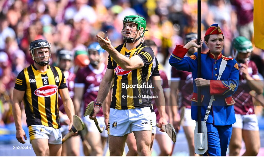 11 June 2023; Kilkenny captain Eoin Cody uses blades of grass to test the wind in the pre-match parade before the Leinster GAA Hurling Senior Championship Final match between Kilkenny and Galway at Croke Park in Dublin. Photo by Piaras Ó Mídheach/Sportsfile