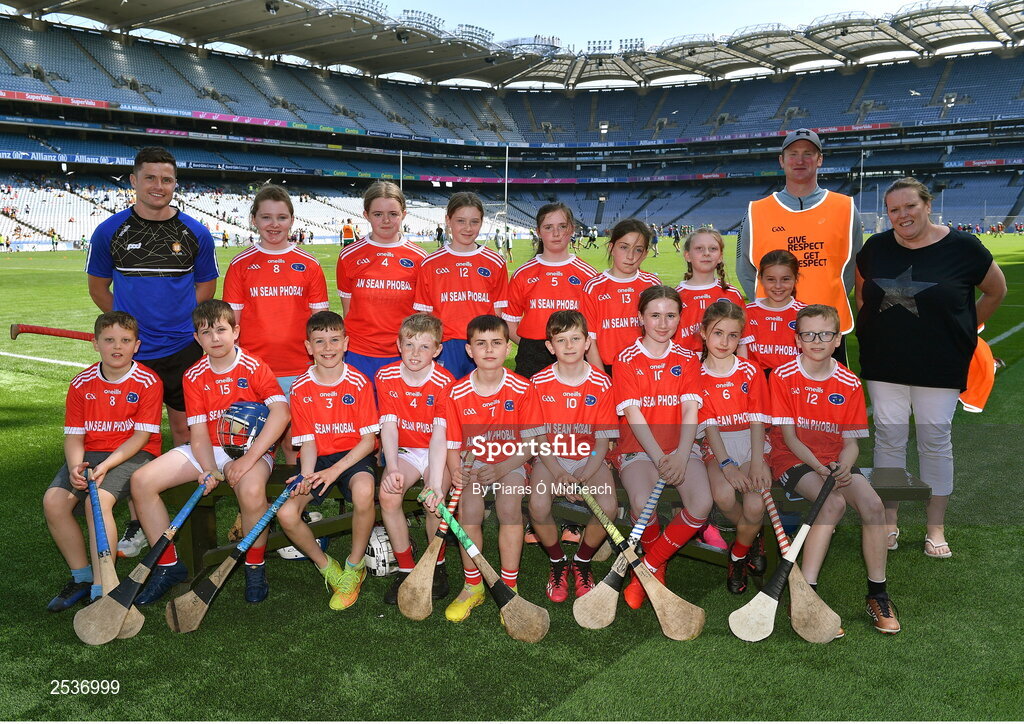 14 June 2023; The SN Bhaile Mhic Airt in Waterford squad with GAA Ambasadóir na Gaeilge Paul Flanagan during the GAAgaeilge Go Games at Croke Park in Dublin. Photo by Piaras Ó Mídheach/Sportsfile