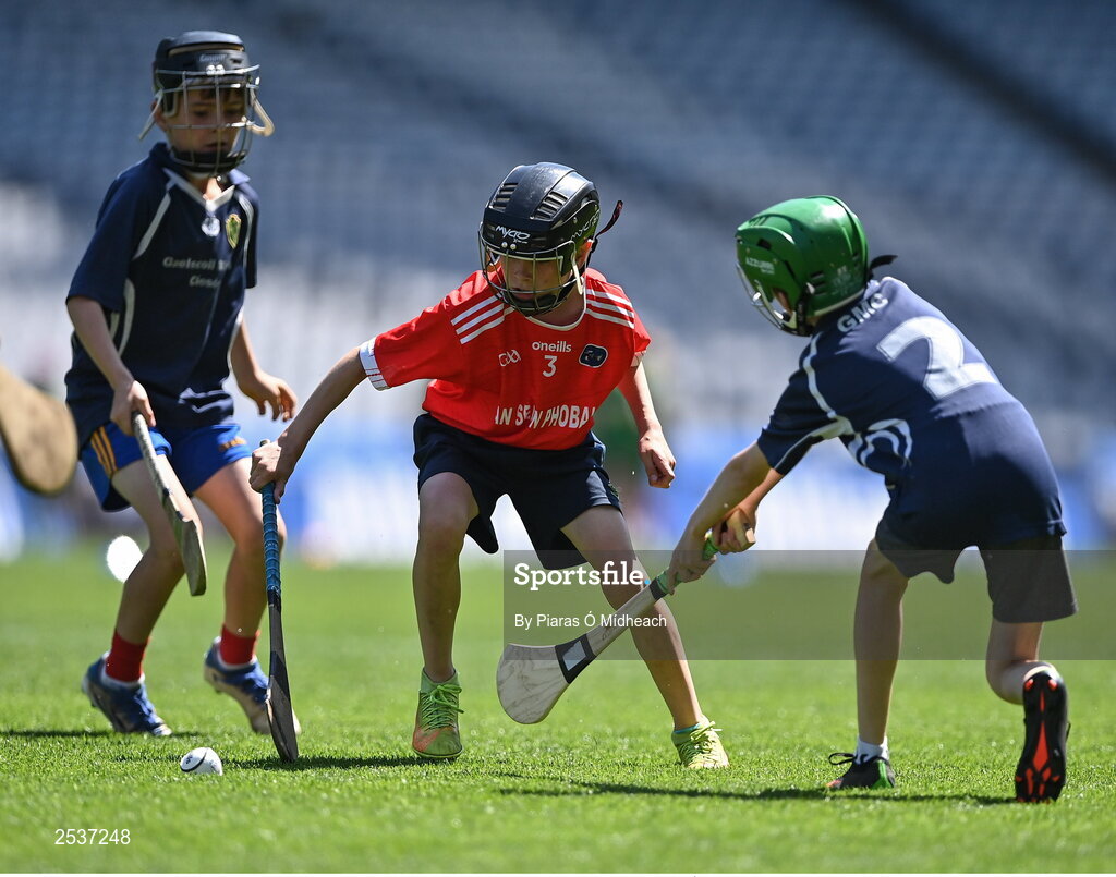14 June 2023; Action from SN Bhaile Mhic Airt in Waterford and Gaelscoil Mhíchíl Cíosóg from Ennis, Clare, during the GAAgaeilge Go Games at Croke Park in Dublin. Photo by Piaras Ó Mídheach/Sportsfile