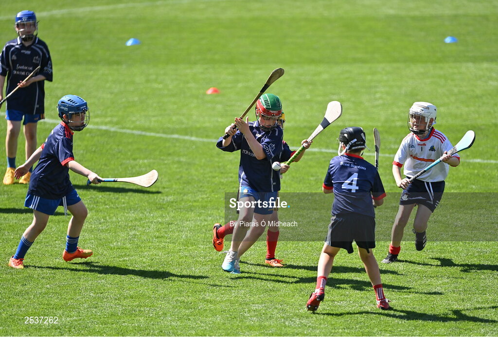14 June 2023; Action between Scoil Santain in Tallaght, Dublin, and Gaelscoil Mhíchíl Cíosóg from Ennis, Clare, during the GAAgaeilge Go Games at Croke Park in Dublin. Photo by Piaras Ó Mídheach/Sportsfile