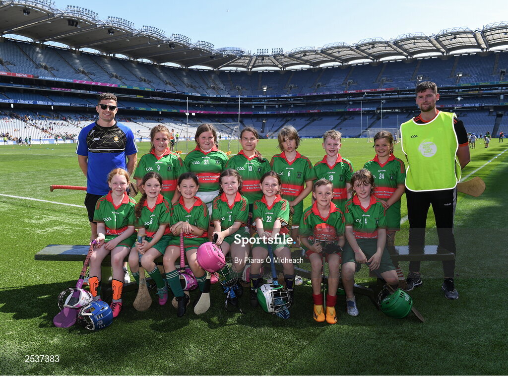 14 June 2023; The Gaelscoil Chluain Dolcáin, Dublin, squad with GAA Ambasadóir na Gaeilge Paul Flanagan during the GAAgaeilge Go Games at Croke Park in Dublin. Photo by Piaras Ó Mídheach/Sportsfile