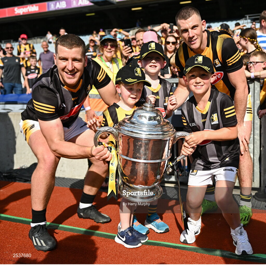 11 June 2023; Kilkenny goalkeeper Eoin Murphy and Eoin Cody of Kilkenny with the Bob O'Keeffe Cup after the Leinster GAA Hurling Senior Championship Final match between Kilkenny and Galway at Croke Park in Dublin. Photo by Harry Murphy/Sportsfile