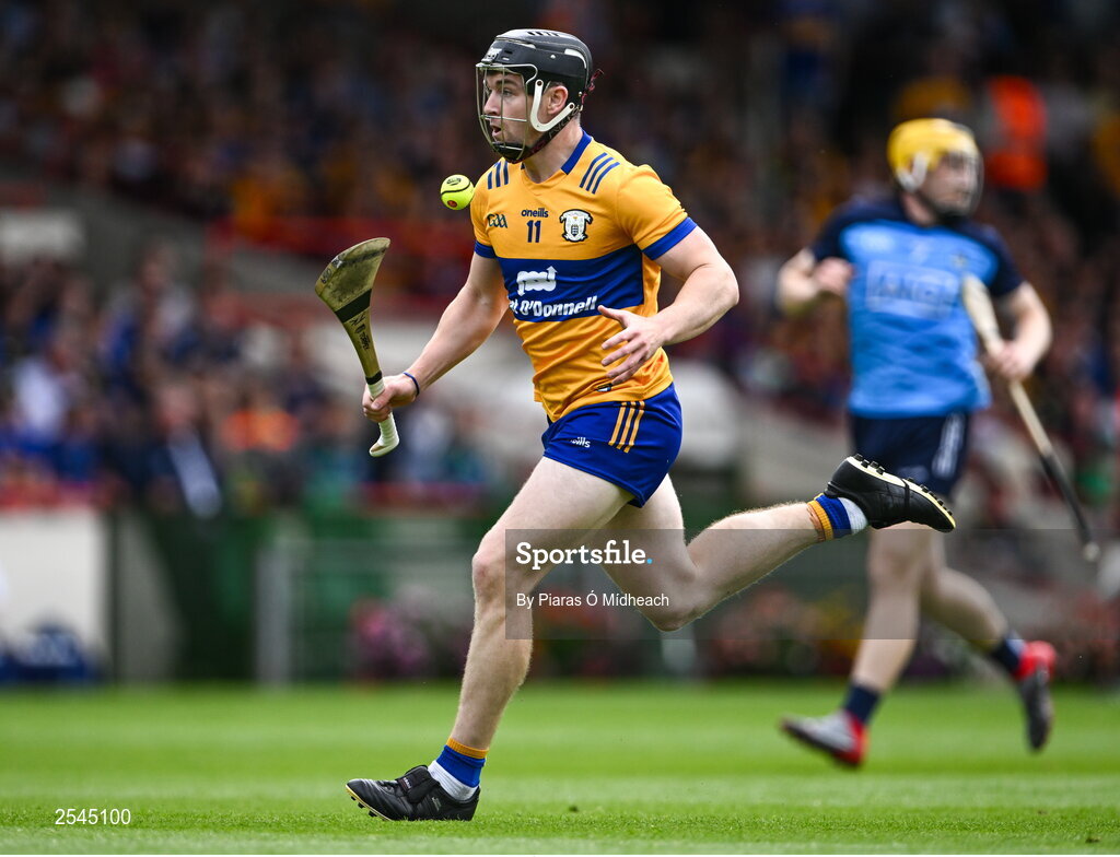 24 June 2023; Tony Kelly of Clare on his way to scoring his side's first goal during the GAA Hurling All-Ireland Senior Championship Quarter Final match between Clare and Dublin at TUS Gaelic Grounds in Limerick. Photo by Piaras Ó Mídheach/Sportsfile