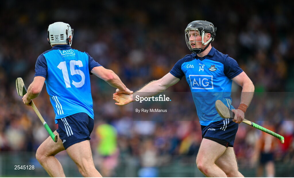 24 June 2023; Darragh Power of Dublin, 15, celebrates scoring a goal in the 18th minute with teammate Cian O'Sullivan during the GAA Hurling All-Ireland Senior Championship Quarter Final match between Clare and Dublin at TUS Gaelic Grounds in Limerick. Photo by Ray McManus/Sportsfile