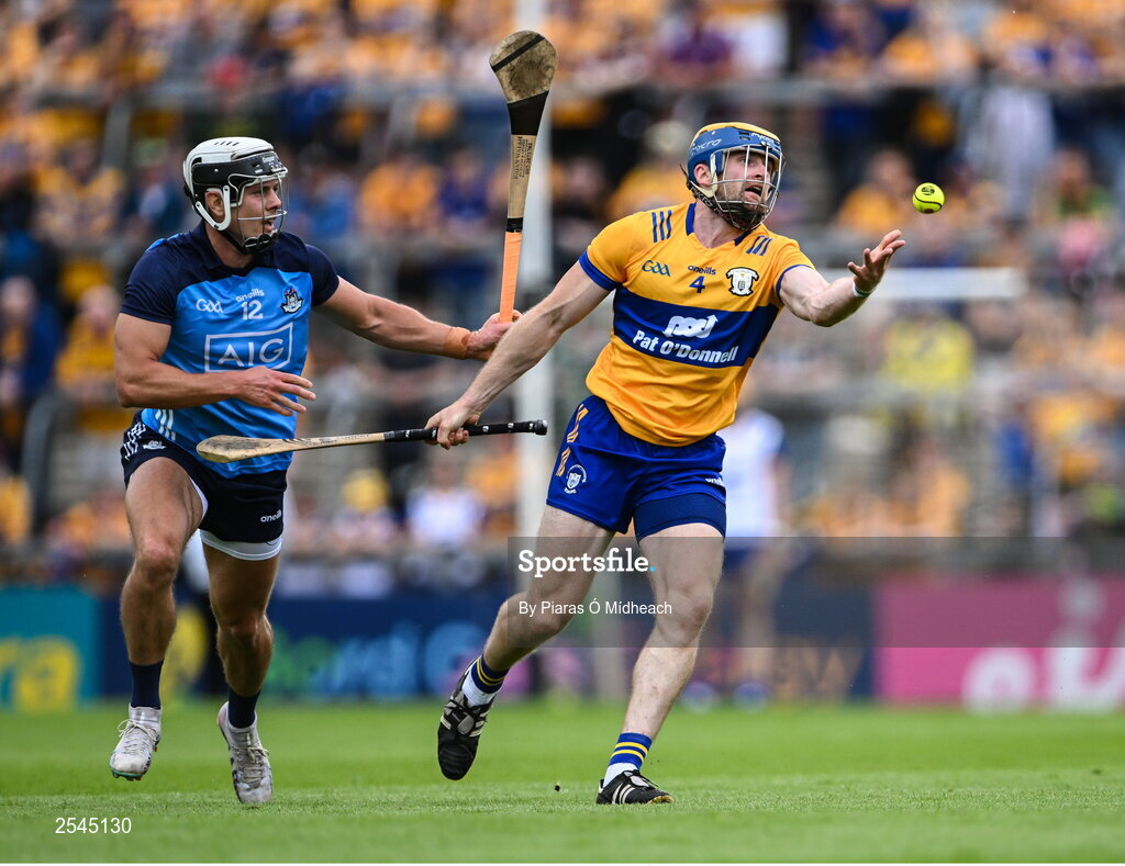 24 June 2023; Seadna Morey of Clare in action against Cian Boland of Dublin during the GAA Hurling All-Ireland Senior Championship Quarter Final match between Clare and Dublin at TUS Gaelic Grounds in Limerick. Photo by Piaras Ó Mídheach/Sportsfile