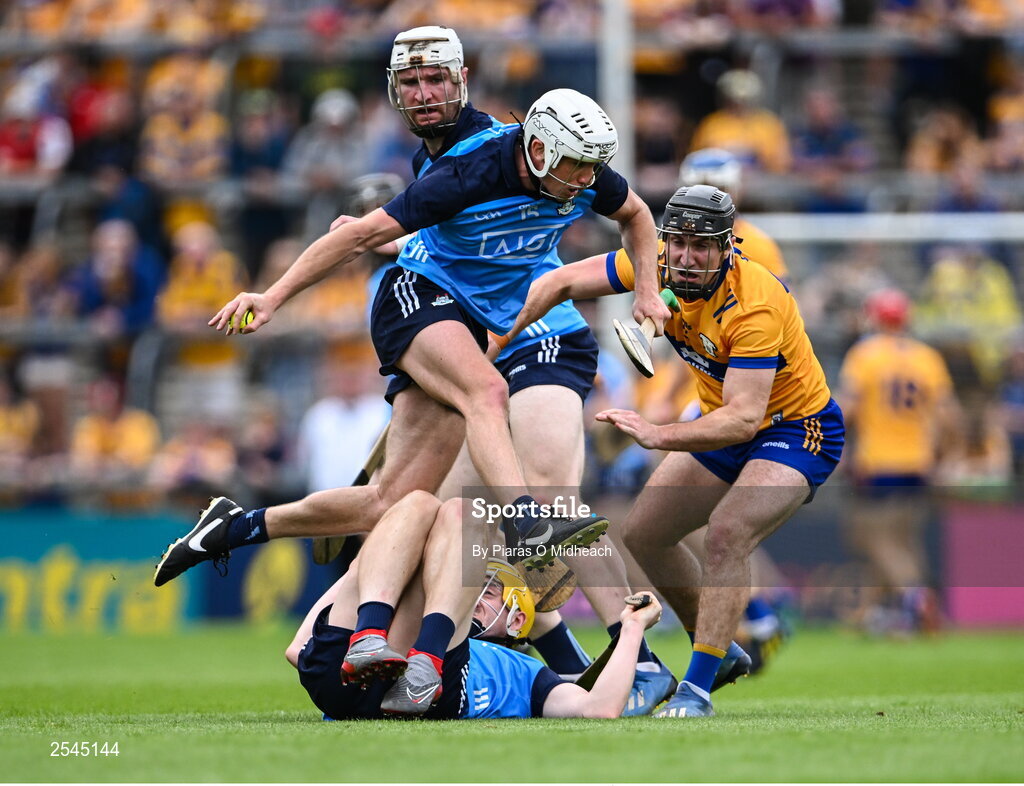 24 June 2023; Darragh Power of Dublin jumps over teammate Daire Gray during the GAA Hurling All-Ireland Senior Championship Quarter Final match between Clare and Dublin at TUS Gaelic Grounds in Limerick. Photo by Piaras Ó Mídheach/Sportsfile