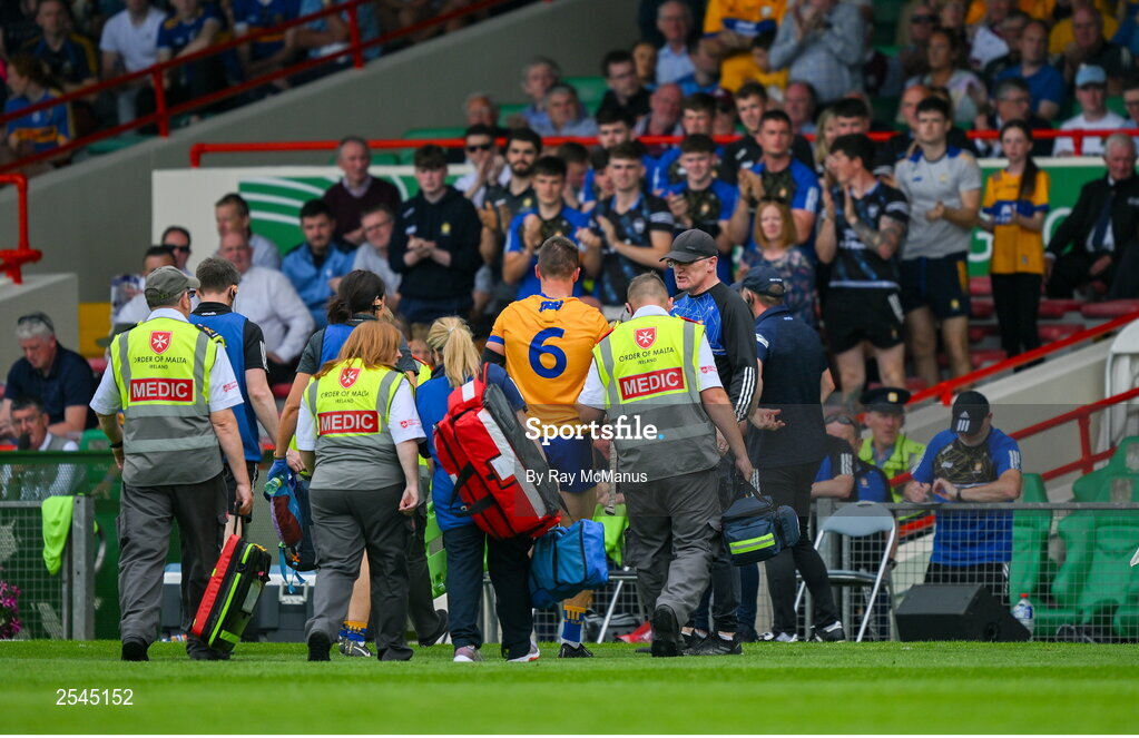 24 June 2023; Clare hurling manager Brian Lohan looks on as John Conlon of Clare leaves the field, injured, during the GAA Hurling All-Ireland Senior Championship Quarter Final match between Clare and Dublin at TUS Gaelic Grounds in Limerick. Photo by Ray McManus/Sportsfile