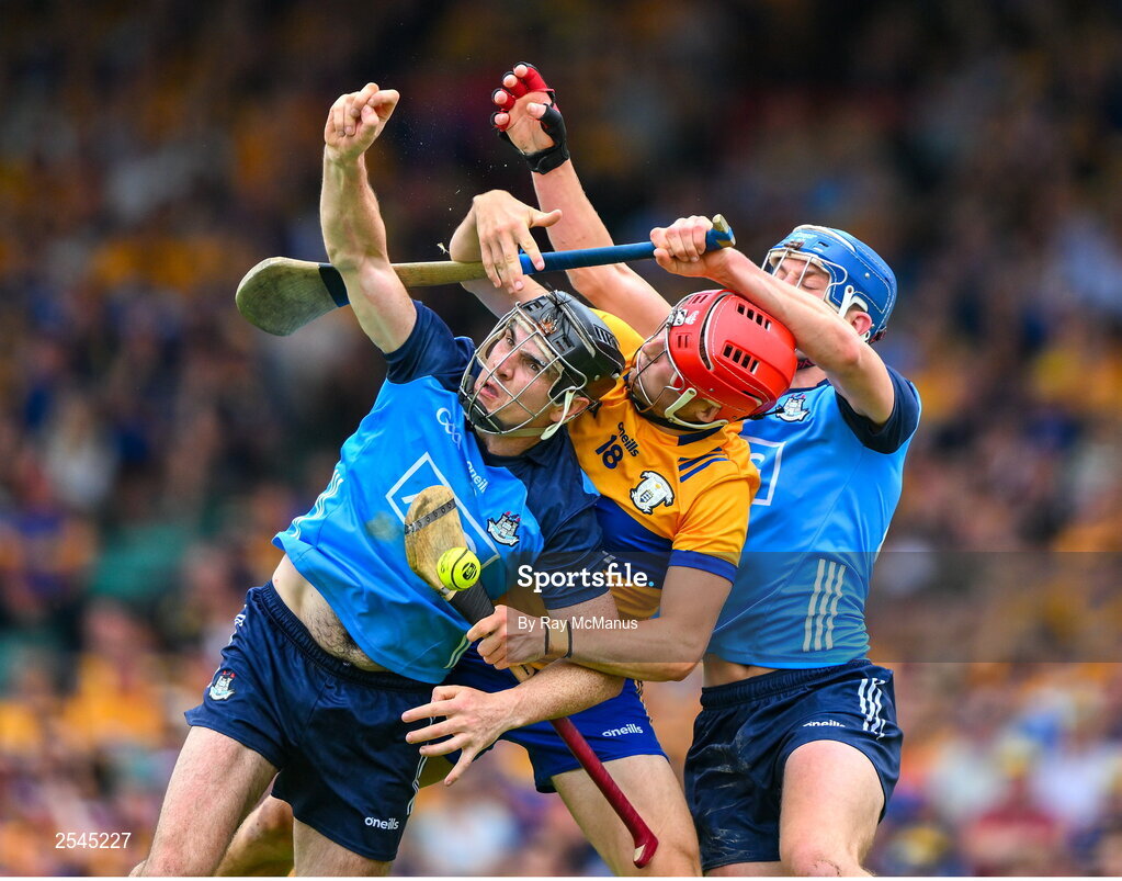 24 June 2023; Danny Sutcliffe of Dublin and his teammate Paul Crummey fail to catch the sliothar ahead of Darragh Lohan of Clare during the GAA Hurling All-Ireland Senior Championship Quarter Final match between Clare and Dublin at TUS Gaelic Grounds in Limerick. Photo by Ray McManus/Sportsfile