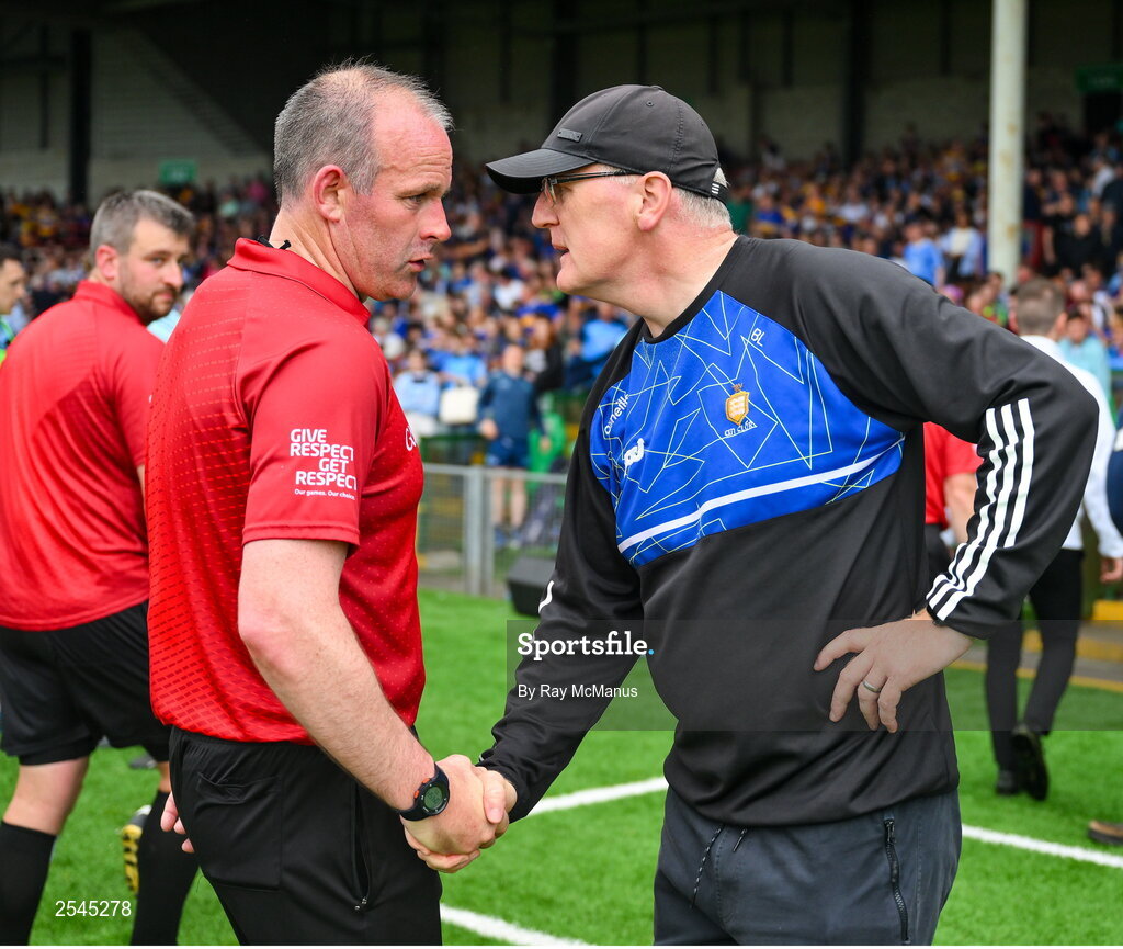 24 June 2023; Referee Johnny Murphy, left, and Clare hurling manager Brian Lohan, shake hands after the GAA Hurling All-Ireland Senior Championship Quarter Final match between Clare and Dublin at TUS Gaelic Grounds in Limerick. Photo by Ray McManus/Sportsfile