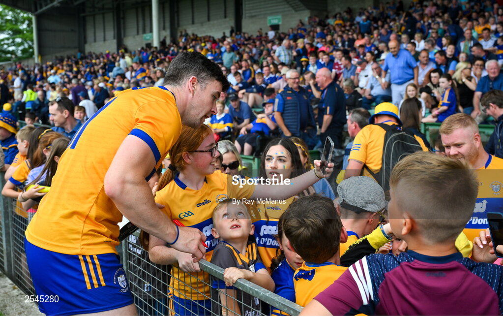 24 June 2023; Tony Kelly of Clare with young supporters after the GAA Hurling All-Ireland Senior Championship Quarter Final match between Clare and Dublin at TUS Gaelic Grounds in Limerick. Photo by Ray McManus/Sportsfile