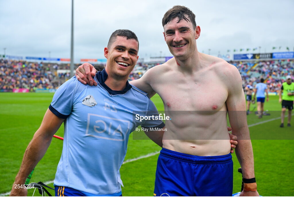 24 June 2023; Cian Nolan of Clare, left, and David Fitzgerald after the GAA Hurling All-Ireland Senior Championship Quarter Final match between Clare and Dublin at TUS Gaelic Grounds in Limerick. Photo by Ray McManus/Sportsfile