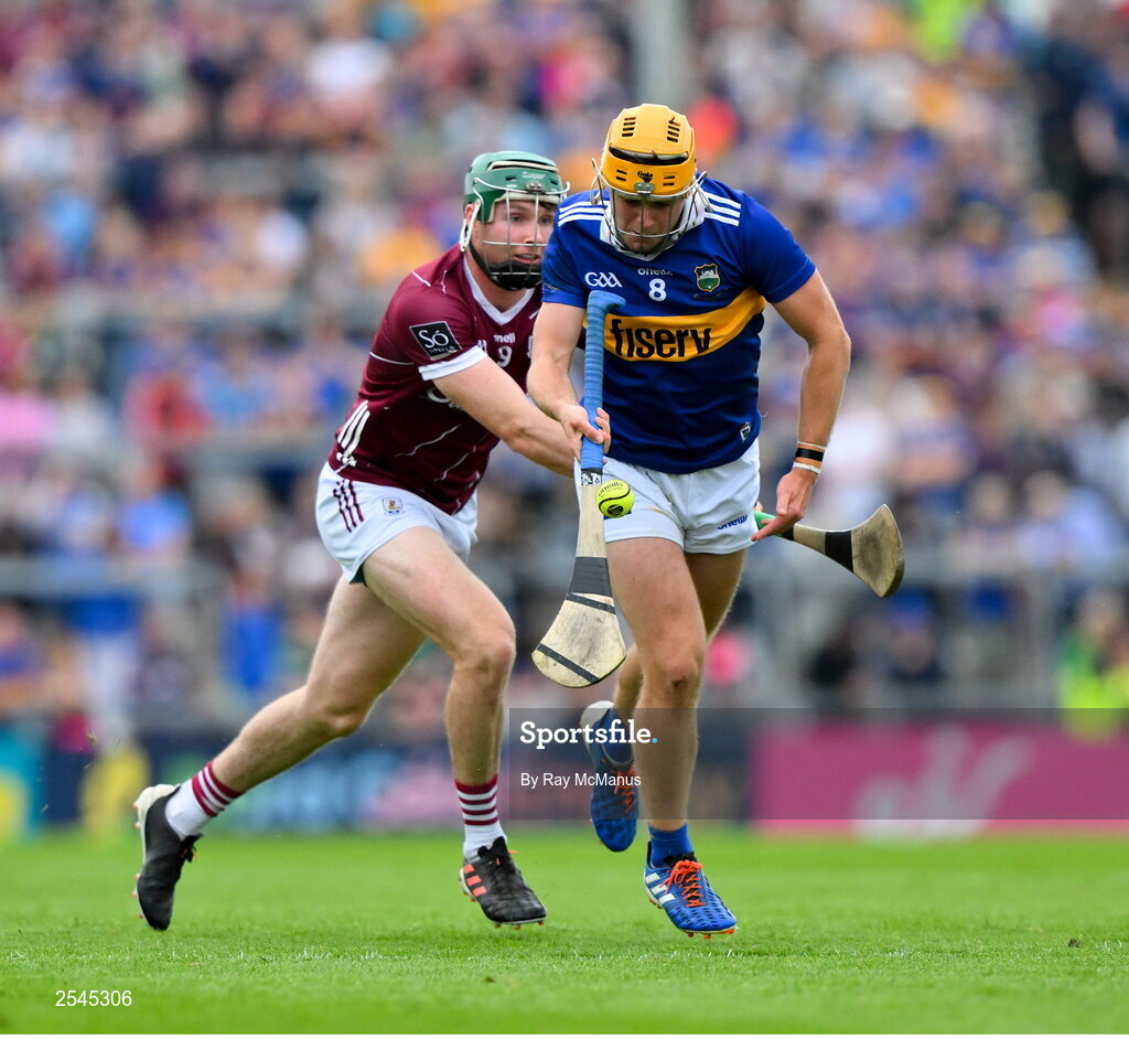 24 June 2023; Conor Stakelum of Tipperary is tackled by Cathal Mannion of Galway during the GAA Hurling All-Ireland Senior Championship Quarter Final match between Galway and Tipperary at TUS Gaelic Grounds in Limerick. Photo by Ray McManus/Sportsfile