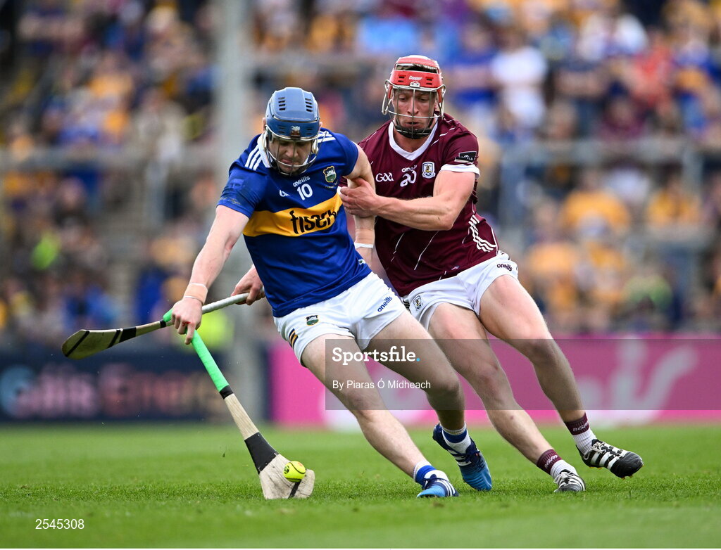24 June 2023; Alan Tynan of Tipperary in action against Ronan Glennon of Galway during the GAA Hurling All-Ireland Senior Championship Quarter Final match between Galway and Tipperary at TUS Gaelic Grounds in Limerick. Photo by Piaras Ó Mídheach/Sportsfile