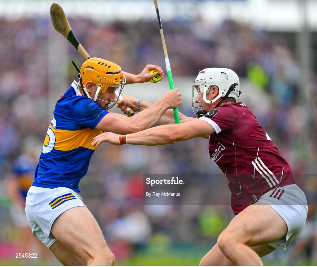 24 June 2023; Mark Kehoe of Tipperary is tackled by Darren Morrissey of Galway during the GAA Hurling All-Ireland Senior Championship Quarter Final match between Galway and Tipperary at TUS Gaelic Grounds in Limerick. Photo by Ray McManus/Sportsfile
