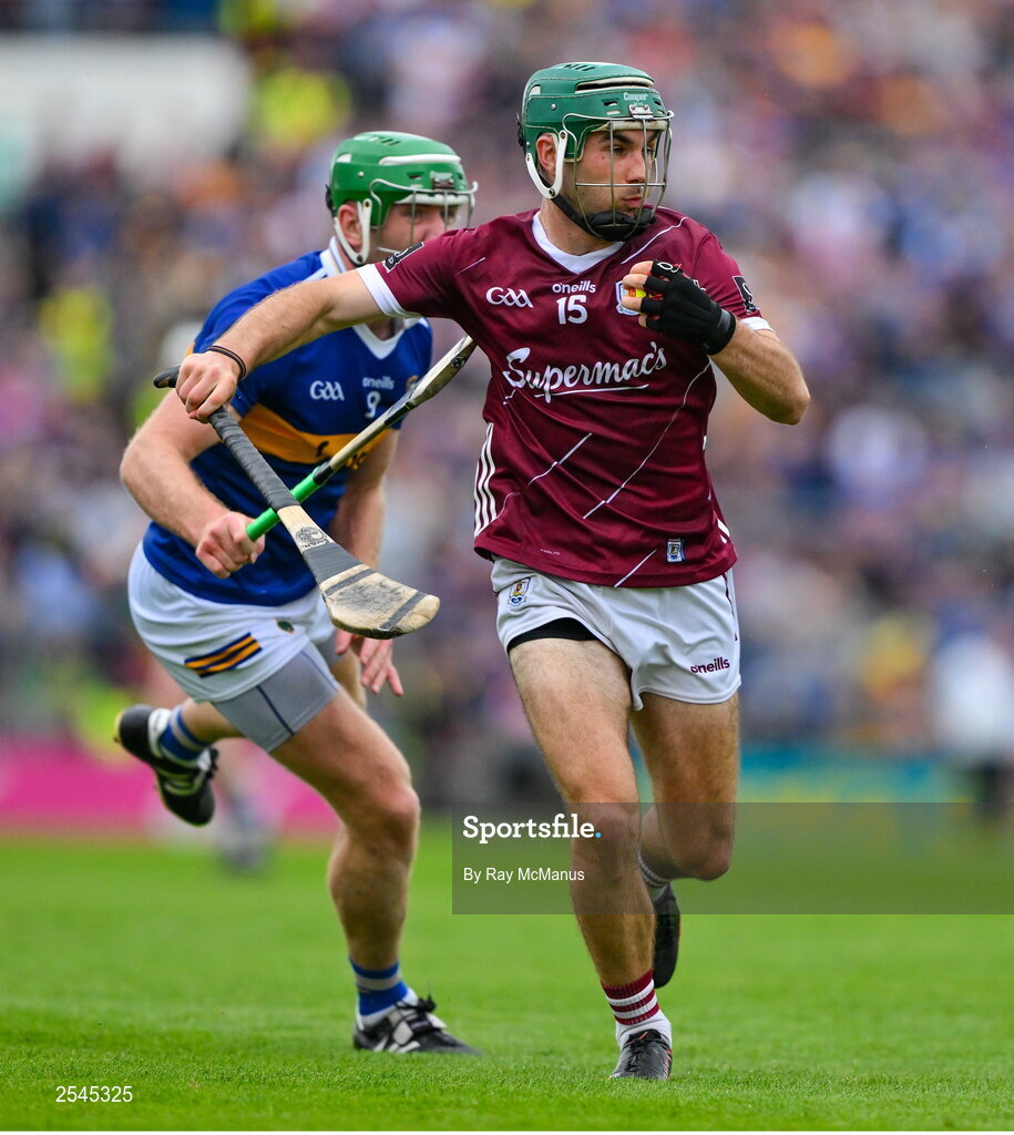 24 June 2023; Evan Niland of Galway is tackled by Noel McGrath of Tipperary during the GAA Hurling All-Ireland Senior Championship Quarter Final match between Galway and Tipperary at TUS Gaelic Grounds in Limerick. Photo by Ray McManus/Sportsfile