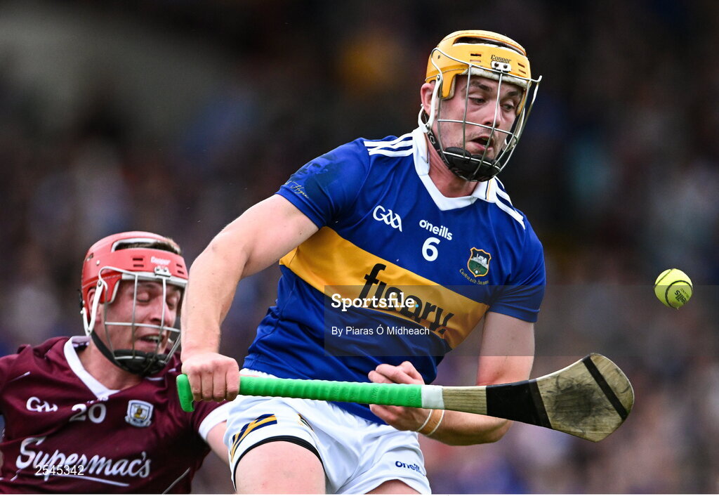 24 June 2023; Ronan Maher of Tipperary in action against Ronan Glennon of Galway during the GAA Hurling All-Ireland Senior Championship Quarter Final match between Galway and Tipperary at TUS Gaelic Grounds in Limerick. Photo by Piaras Ó Mídheach/Sportsfile