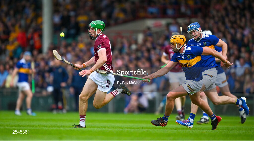 24 June 2023; Cianan Fahy of Galway is tackled by Ronan Maher of Tipperary during the GAA Hurling All-Ireland Senior Championship Quarter Final match between Galway and Tipperary at TUS Gaelic Grounds in Limerick. Photo by Ray McManus/Sportsfile