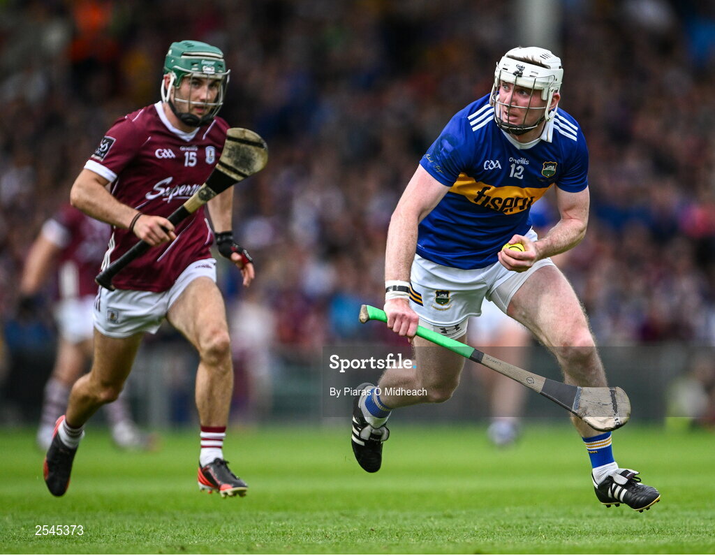 24 June 2023; Séamus Kennedy of Tipperary in action against Evan Niland of Galway during the GAA Hurling All-Ireland Senior Championship Quarter Final match between Galway and Tipperary at TUS Gaelic Grounds in Limerick. Photo by Piaras Ó Mídheach/Sportsfile