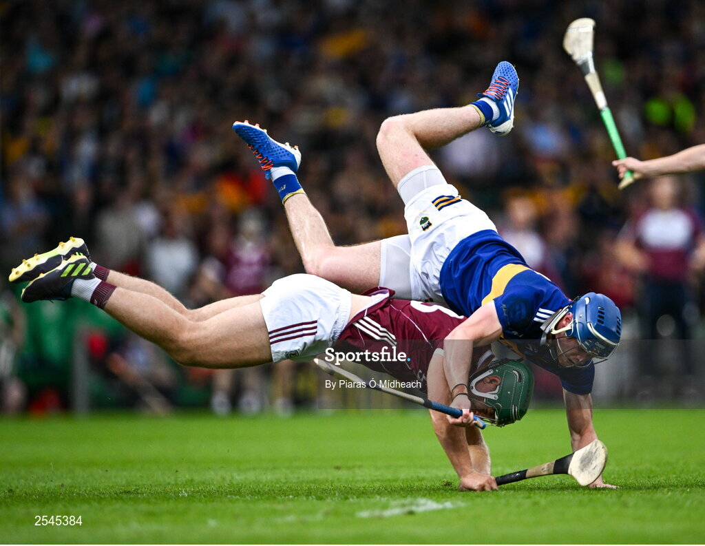 24 June 2023; Fintan Burke of Galway is fouled by Conor Bowe of Tipperary during the GAA Hurling All-Ireland Senior Championship Quarter Final match between Galway and Tipperary at TUS Gaelic Grounds in Limerick. Photo by Piaras Ó Mídheach/Sportsfile