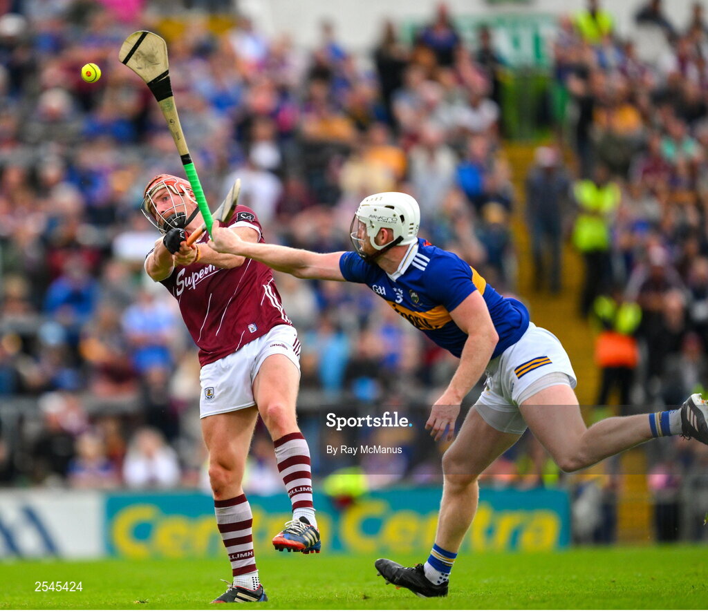 24 June 2023; Conor Whelan of Galway is tackled by Michael Breen of Tipperary during the GAA Hurling All-Ireland Senior Championship Quarter Final match between Galway and Tipperary at TUS Gaelic Grounds in Limerick. Photo by Ray McManus/Sportsfile