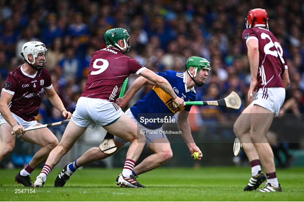 24 June 2023; Noel McGrath of Tipperary in action against Cathal Mannion of Galway during the GAA Hurling All-Ireland Senior Championship Quarter Final match between Galway and Tipperary at TUS Gaelic Grounds in Limerick. Photo by Piaras Ó Mídheach/Sportsfile