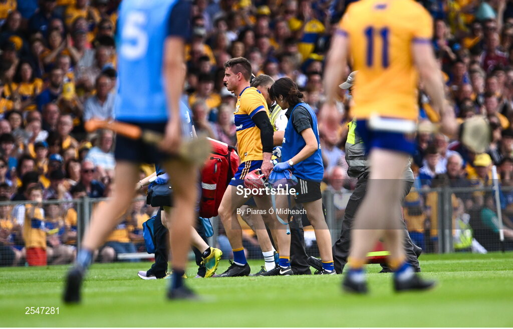 24 June 2023; John Conlon of Clare leaves the pitch to receive medical attention for an injury during the GAA Hurling All-Ireland Senior Championship Quarter Final match between Clare and Dublin at TUS Gaelic Grounds in Limerick. Photo by Piaras Ó Mídheach/Sportsfile