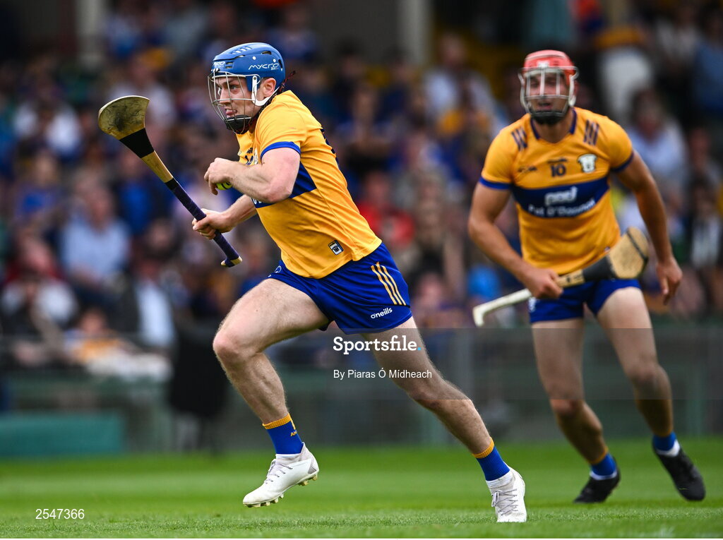 24 June 2023; Shane O'Donnell of Clare, supported by teammate Peter Duggan, right, during the GAA Hurling All-Ireland Senior Championship Quarter Final match between Clare and Dublin at TUS Gaelic Grounds in Limerick. Photo by Piaras Ó Mídheach/Sportsfile