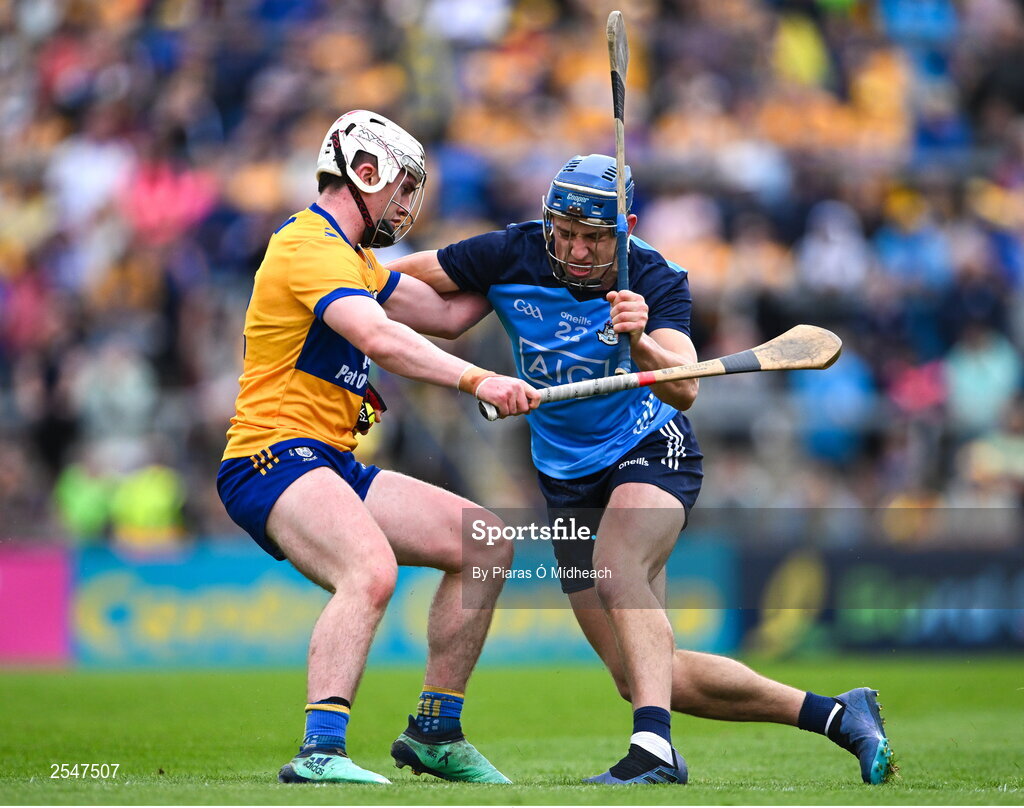 24 June 2023; Paul Crummey of Dublin in action against Adam Hogan of Clare during the GAA Hurling All-Ireland Senior Championship Quarter Final match between Clare and Dublin at TUS Gaelic Grounds in Limerick. Photo by Piaras Ó Mídheach/Sportsfile