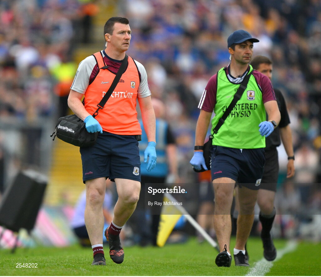 24 June 2023; Galway Dr. Eoin MacDonncha and physiotherapist Eamon Duane, right, during the GAA Hurling All-Ireland Senior Championship Quarter Final match between Galway and Tipperary at TUS Gaelic Grounds in Limerick. Photo by Ray McManus/Sportsfile