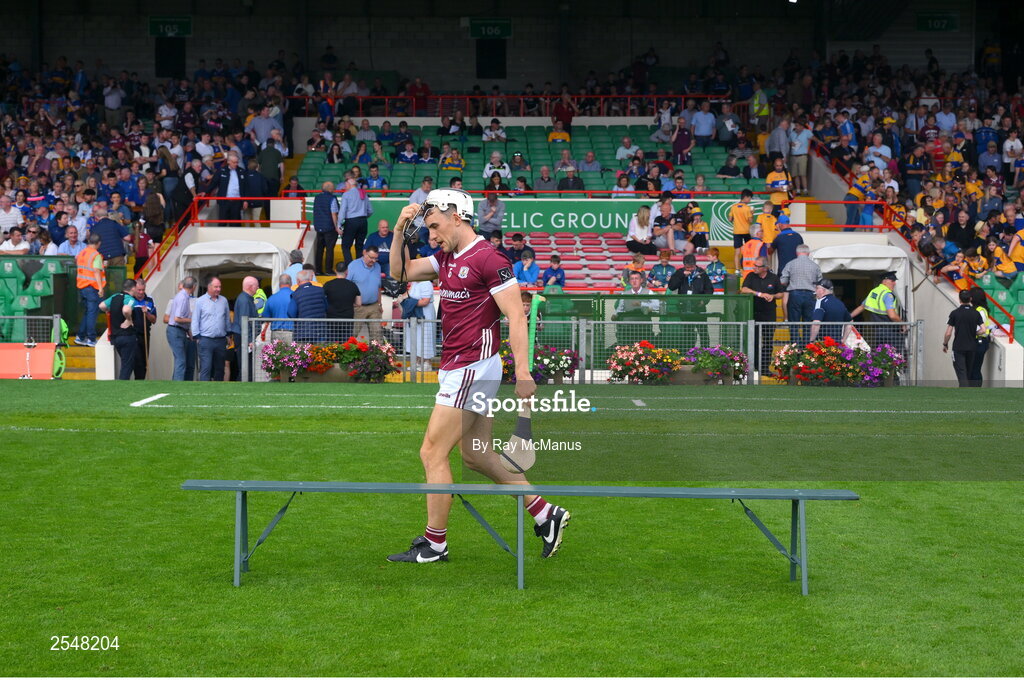 24 June 2023; Daithí Burke of Galway removes his helmet before the team photograph ahead of the GAA Hurling All-Ireland Senior Championship Quarter Final match between Galway and Tipperary at TUS Gaelic Grounds in Limerick. Photo by Ray McManus/Sportsfile