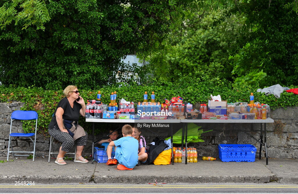 24 June 2023; A street trader makes a phone call as three children take shelter under her stall before the GAA Hurling All-Ireland Senior Championship Quarter Final match between Clare and Dublin at TUS Gaelic Grounds in Limerick. Photo by Ray McManus/Sportsfile